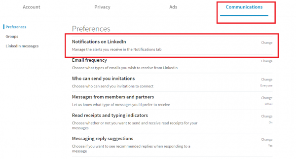 You should now see ‘Notifications on Linkedin’. Clicking on ‘change’ will now take you to another screen.