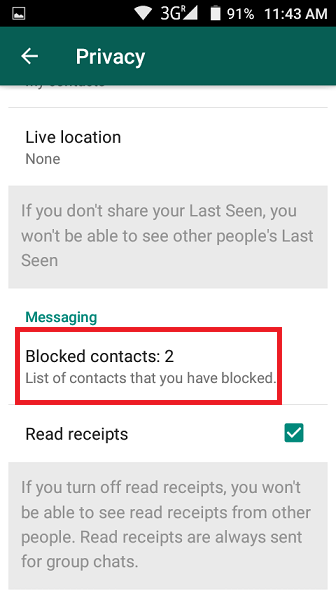 Tap “Blocked” near the bottom of the Privacy page. This will open your WhatsApp block list.