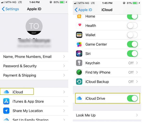 Scroll down to find iCloud Drive , turn it on, and make sure that the “WhatsApp” option is also on.