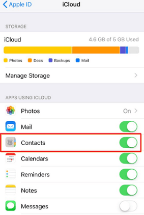 Step 3. Now, tap on “iCloud” and then tap on “Contacts.” Next, toggle to the Contact slider to the right to turn it on.