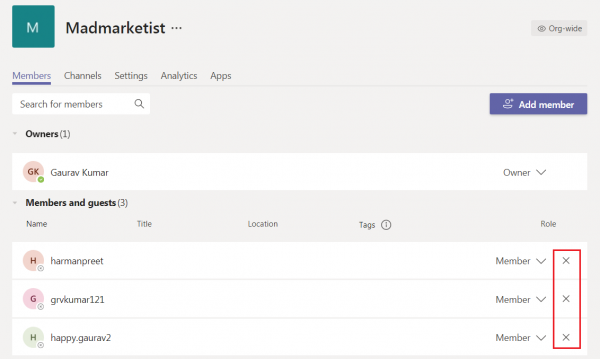 Once identified, click on the (x) icon on the right side of that member’s name and it will delete the member from that particular team.