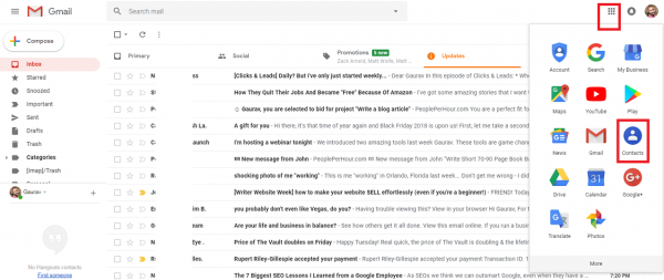Go to your Google account and select ‘Contacts’. This is normally found by either typing ‘Contacts’ into your search bar or by clicking on the block of 9 squares next to your profile picture (if you’re signed into Gmail).