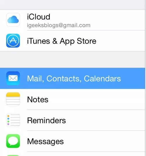 In Settings, tap ‘Mail, Contacts and Calendars’.