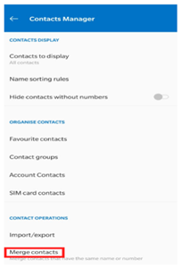 2. At the top Right > tap settings > Contacts Manager> Merge contacts (as shown in Image 1)