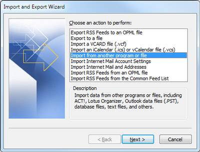 The Import/Export wizard will open asking how you wish to import. If you’re importing a CSV file, go to ‘Import from another program or file’.