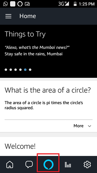 To make a call, you can simply call out to Alexa or open the Alexa app on your phone and click on this center icon from the bottom.