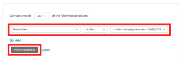 - You can set the condition in the drop-down menu as per the requirement. As per the example, Set the drop-down menus to Date Added > is after > the last campaign was sent (date) (as shown in Image 3).