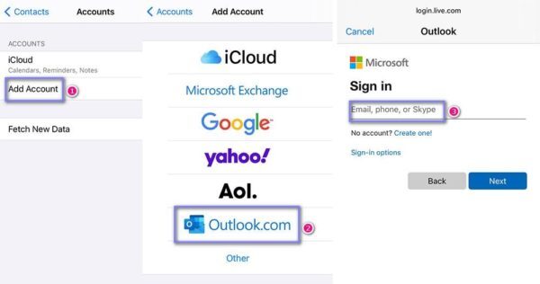 Step 2. Now click on “Add Account,” then select “Outlook.com” and log in using your credentials. Sync the iPhone contacts to Outlook just like the previous versions.