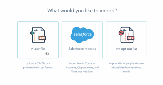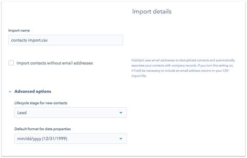 To import a list of contacts it must be in .csv file format and there must be headers such as ‘name’, ‘email’ etc. The categories will be mapped later in the process. Hubspot also requires that each contact has an email, so make sure your file is properly formatted before proceeding.