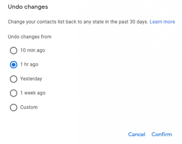 3. A dialog box will pop up, letting you restore your contact list to the state it was in at any point within the past 30 days. Choose on an option and click on Confirm.