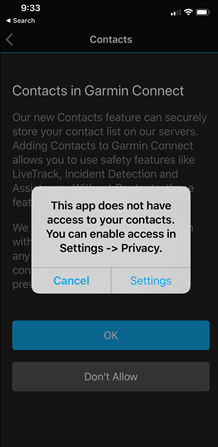 - You’ll receive a prompt saying “Garmin Connect Would Like to Access Your Contacts”, click on OK